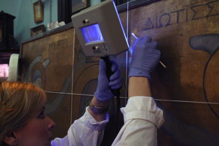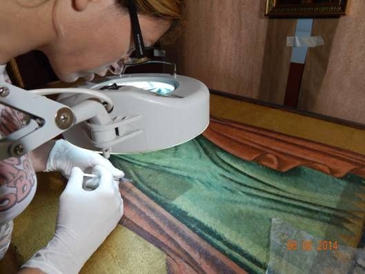 Οι εργασίες πραγματοποιήθηκαν πολύ προσεκτικά με τη χρήση του ηλεκτρονικού μικροσκοπίου χειρός σε ανάλυση 10x -30x, Επίσης καθ όλη τη διάρκεια του καθαρισμού του έργου χρησιμοποιήθηκαν λάμπες υπεριώδους ακτινοβολίας για την ολοκληρωτική αφαίρεση του οξειδωμένου βερνικιού και των παλαιότερων χρωματικών επεμβάσεων.