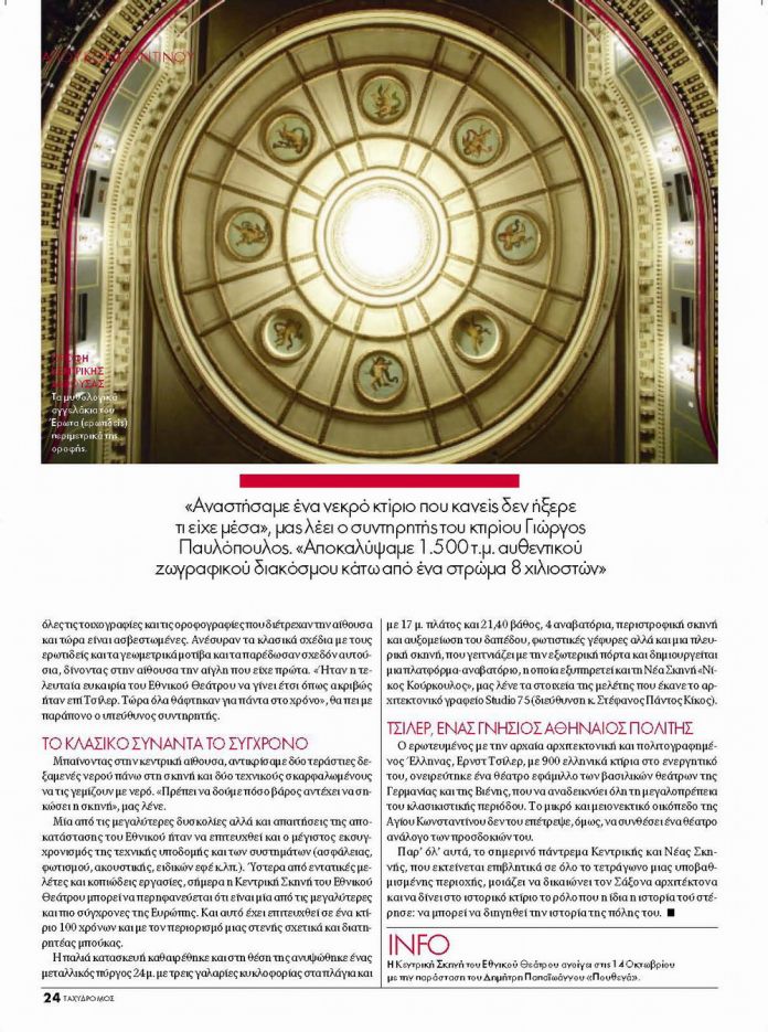 Οι συντηρητές δούλεψαν πολλές φορές σαν αρχαιολόγοι, αφού μέσα στα αρχεία του Εθνικού βρήκαν, χωρίς να έχουν την παραμικρή ένδειξη ή αναφορά, τις αυθεντικές ακουαρέλες του Τσίλερ με όλες τις τοιχογραφίες και τις οροφογραφίες που διέτρεχαν την αίθουσα και τώρα είναι ασβεστωμένες. Ανέσυραν τα κλασικά σχέδια με τους ερωτιδείς και τα γεωμετρικά μοτίβα και τα παρέδωσαν σχεδόν αυτούσια, δίνοντας στην αίθουσα την αίγλη που είχε πρώτα. «'Ήταν η τελευταία ευκαιρία του Εθνικού Θεάτρου να γίνει έτσι όπως ακριβώς ήταν επί Τσίλερ. Τώρα όλα θάφτηκαν για πάντα στο χρόνο», θα πει με παράπονο ο υπεύθυνος συντηρητής.