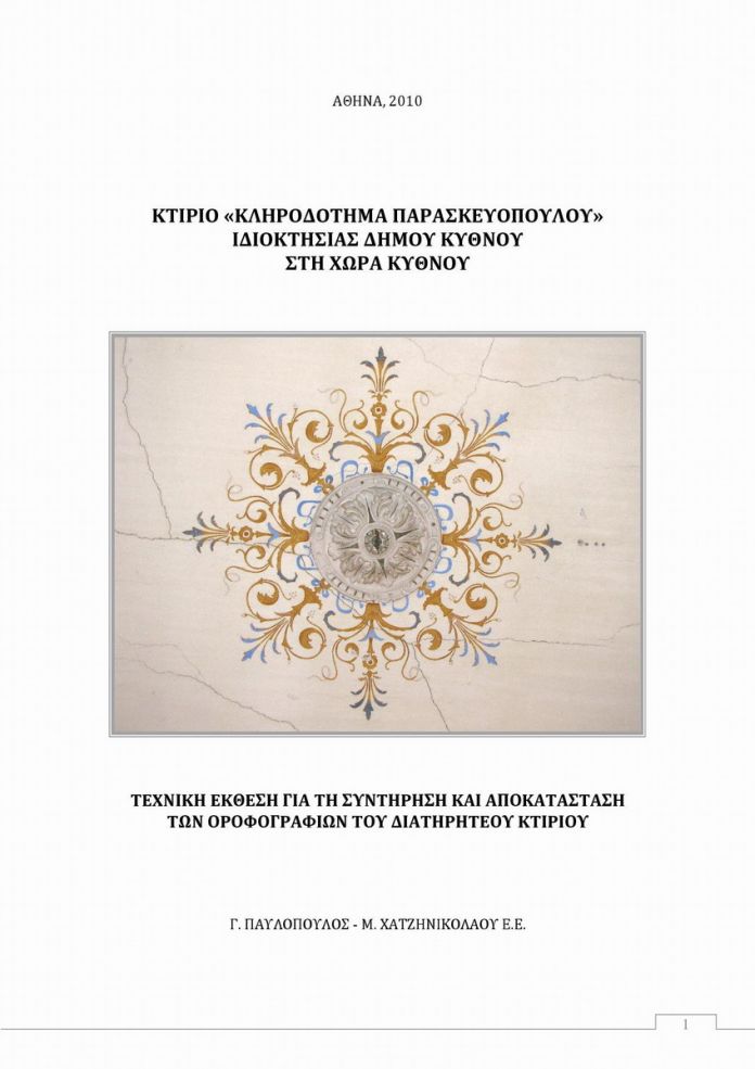 ΚΤΙΡΙΟ ΚΛΗΡΟΔΟΤΗΜΑ ΠΑΡΑΣΚΕΥΟΠΟΥΛΟΥ, ΙΔΙΟΚΤΗΣΙΑΣ ΔΗΜΟΥ ΚΥΘΝΟΥ"Μελέτη συντήρησης και αποκατάστασης του ζωγραφικού διακόσμου του κτιρίου Πρασκευοπούλου, ιδιοκτησίας Δήμου Κύθνου στη Χώρα της Κύθνου"